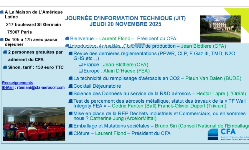 JOURNEE D’INFORMATION TECHNIQUE DU Jeudi 20 NOVEMBRE 2025 La Journée d’Information Technique du CFA aura lieu Jeudi 20 novembre prochain à La Maison de L’ Amérique Latine à Paris (75007). Le programme complet se trouve dans ce lien Programme Journée d’Information Technique 2025 Pour vous inscrire contacter le CFA au 01 40 07 00 90